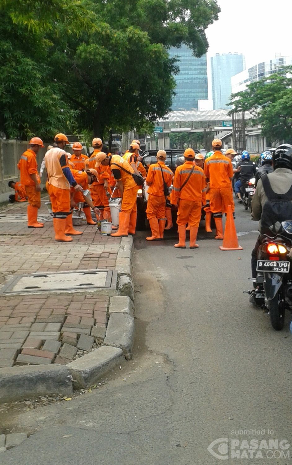 Aksi pasukan oranye yang siap melakukan pengecatan ulang trotoar di depan KPK, Jl Rasuna Said 8.45 WIB.