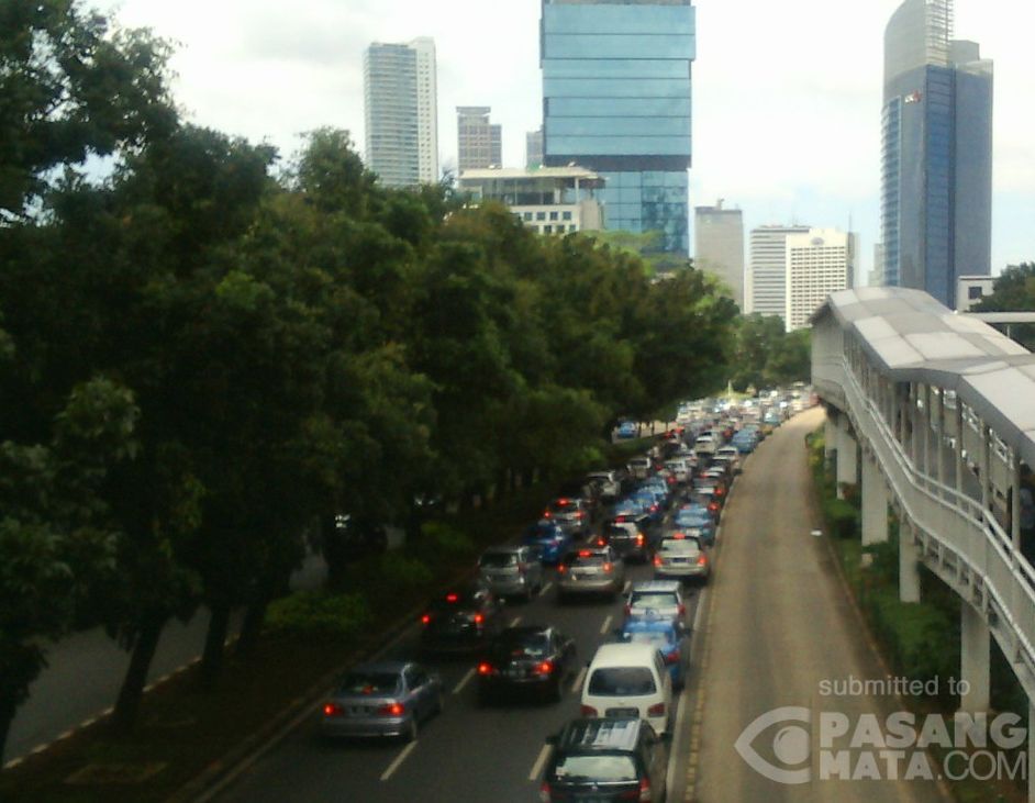 14.25 WIB Kepadatan kendaraan mulai tampak dari patung Jenderal Sudirman menuju Bundaran HI.
