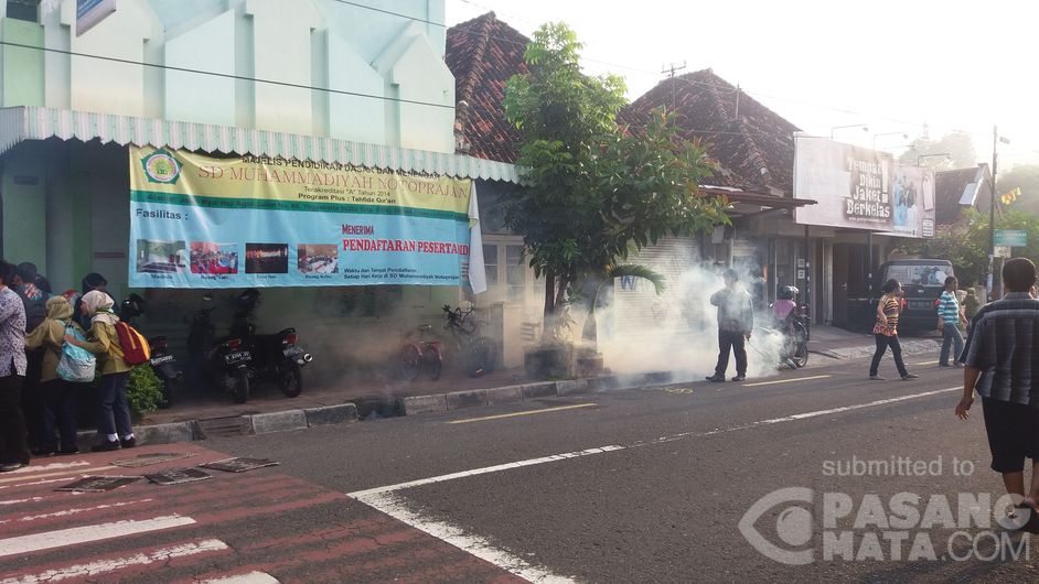 Kawasan Jalan Kyai Haji Agus Salim, Yogyakarta sedang ada penyemprotan nyamuk anti DBD.