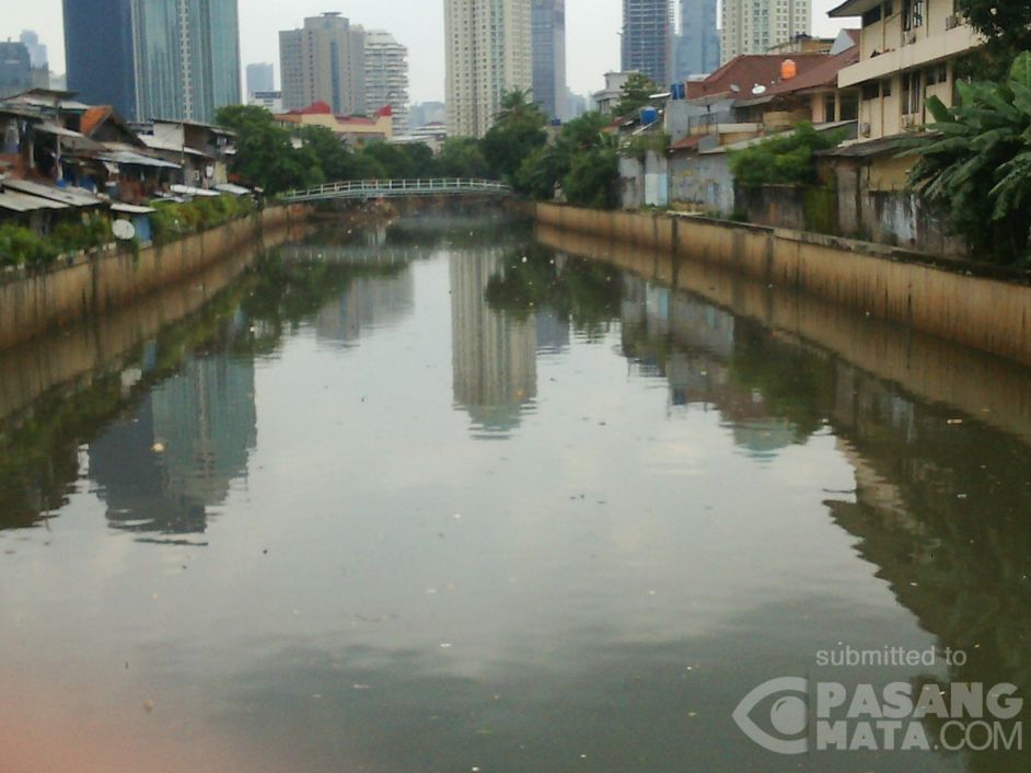 Volume debit air di kali kawasan Benhil meningkat sejak semalam, tampak juga sampah yang melintas di kali ini