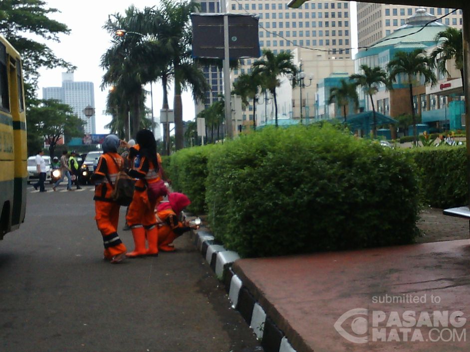 Petugas berseragam oranye sedang melakukan pengecatan trotoar di kawasan Senayan City. Terlihat rekannya yang sedang selfie.