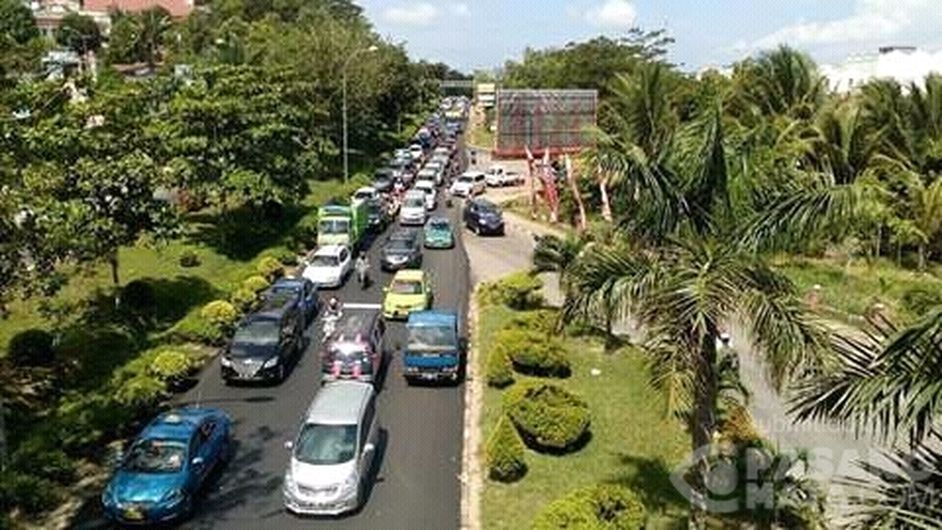Kemacetan panjang dari Tiban arah Southlink karena jalan hanya satu jalur saja bisa dilalui akibat pengaspalan jalan.