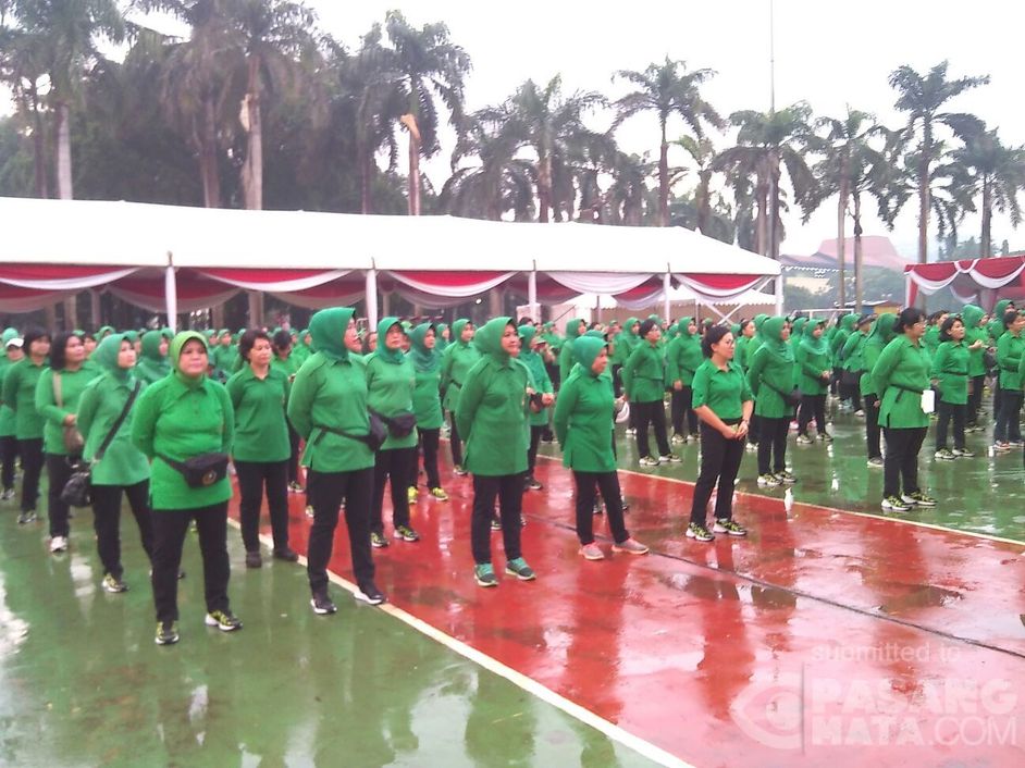 Suasana senam sehat di Monumen Nasional Jakarta Pusat, Selasa, Jakarta Pusat(8/3) dalam rangka olahraga bersama menyambut HUT ke 70 Persit (persatuan istri prajurit) KCK, saat ini sedang berlangsung walaupun cuaca hujan
