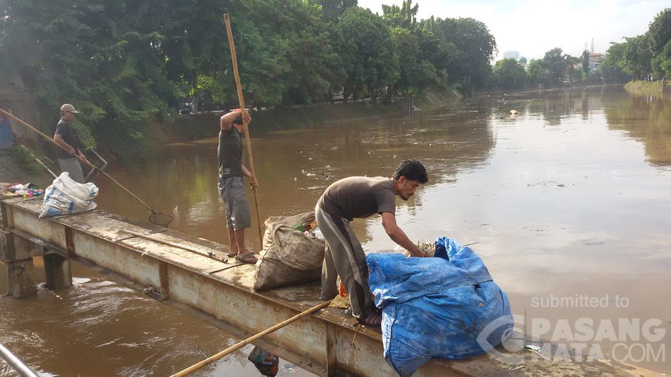 Terlihat warga sedang mengais rezeki dari sampah-sampah yang terbawa air dengan mengambil menggunakan jaring. Lokasi Tebet