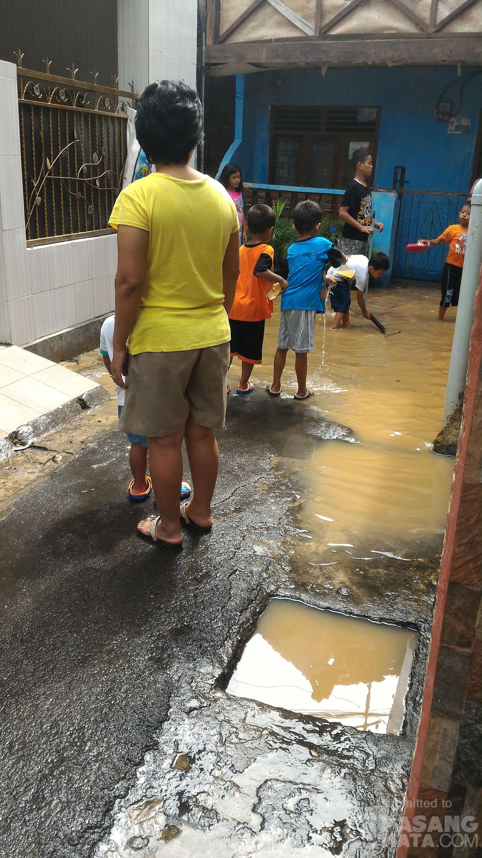 Banjir mulai surut, jadi ajang bermain anak-anak sekaligus kerja bakti pembersihan rumah, got, sampah dan lumpur. Lokasi Kampung Melayu Kecil, Jakarta Selatan