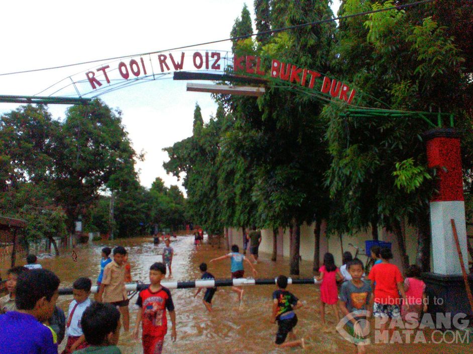 Beginilah kondisi wilayah Bukit Duri yang terkena banjir anak-anak malah sibuk main air pukul 15:03