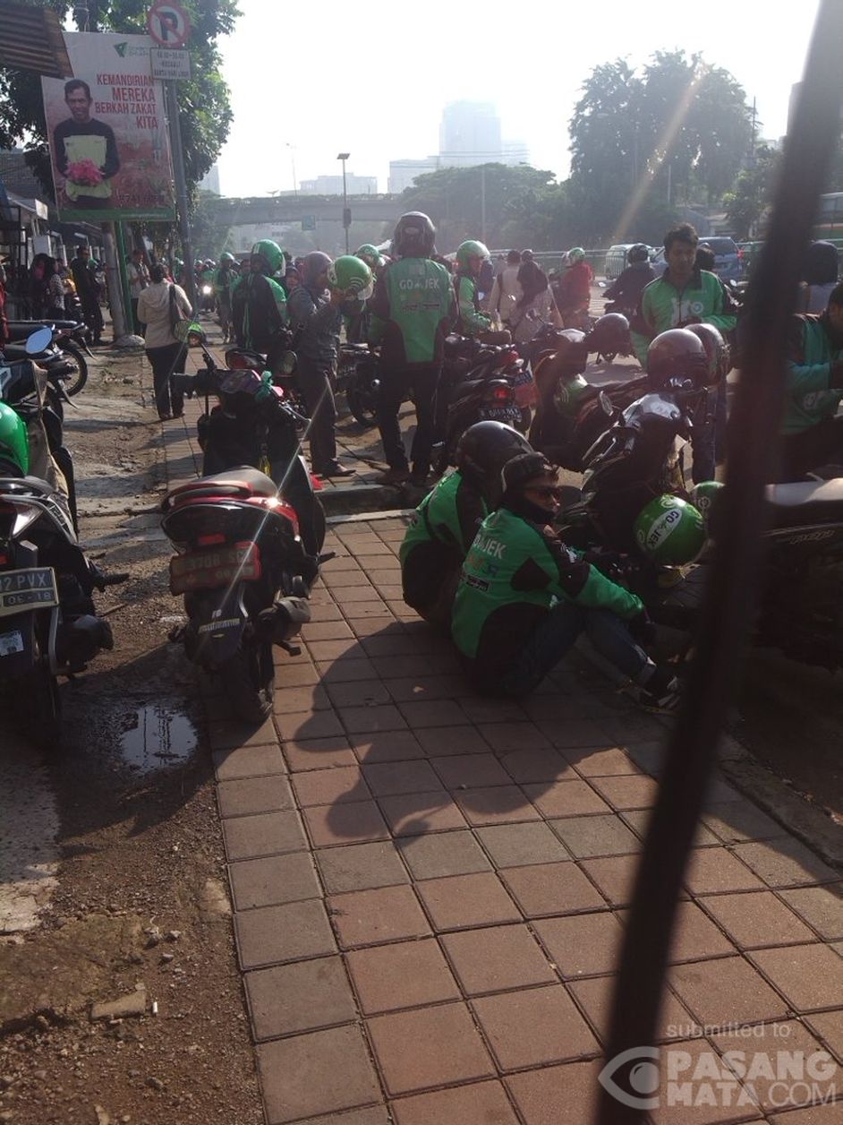 Para driver Gojek dan Grab panen penumpang. Penumpang memilih Gojek dan Grab sebagai alternatif transportasi dari Stasiun Tanah Abang menuju kantor masing-masing.