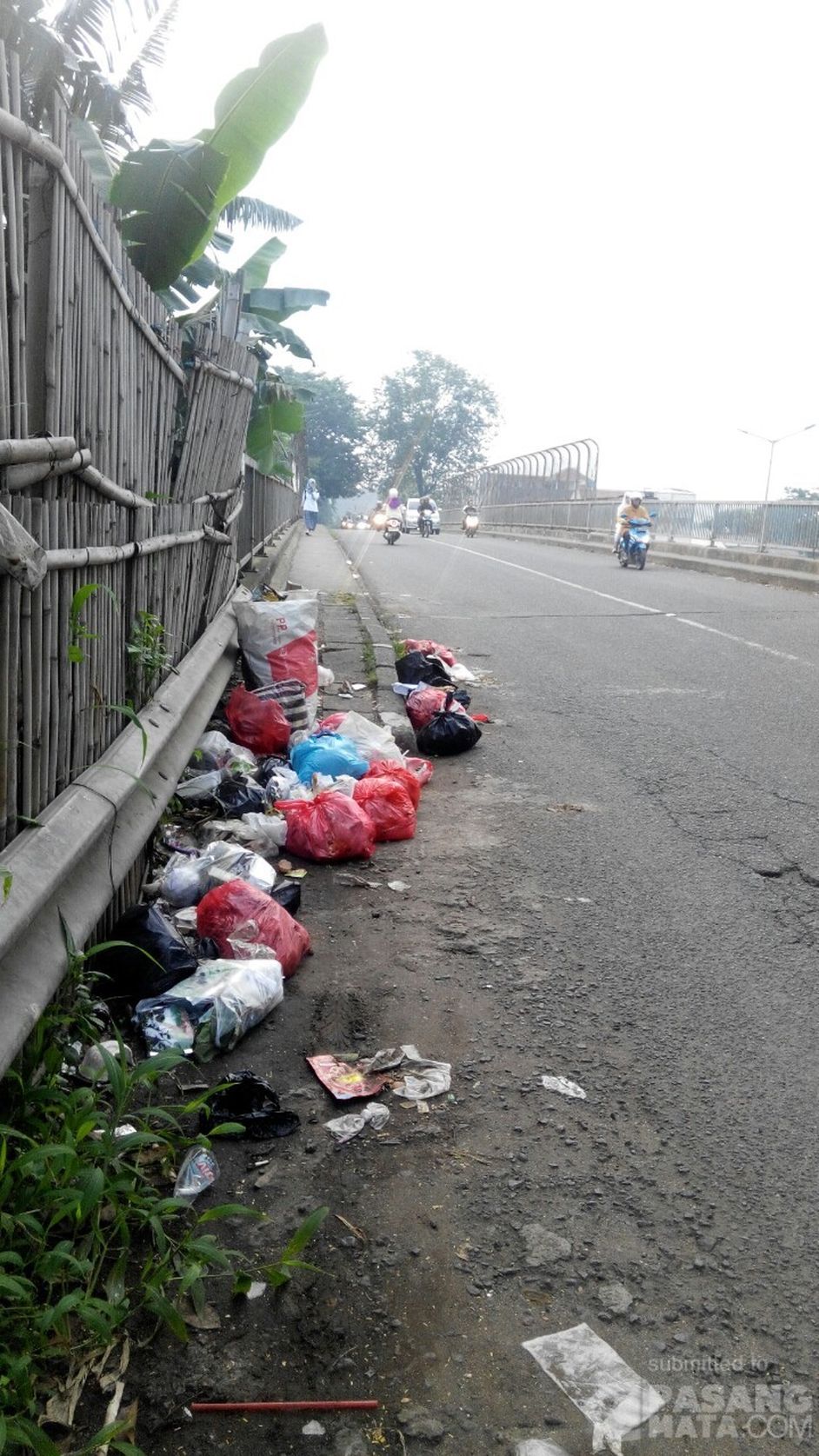 06.55 WIB Jalan Bintara, Bekasi di sekitar jalan tol menjadi 'halte' sampah.