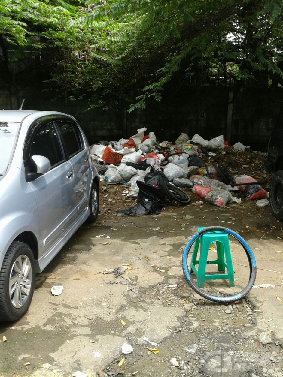 Ada penumpukan sampah di depan gedung Graha Surya jalan Karet Karya Setiabudi. Sampah tersebut berdekatan dengan warung makan dan untuk parkir mobil.