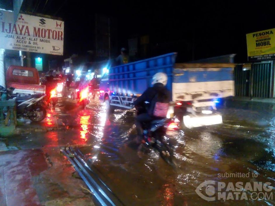 Genangan setinggi 20-50 cm menggenangi Jalan Raya Sawangan, tepatnya Perempatan Mampang, Depok, Jumat (12/3) malam. Hingga pukul 23.00 masih berlangsung dan membuat kemacetan lalu lintas hingga Jalan Dewi Sartika Depok atau sejauh 5 km.