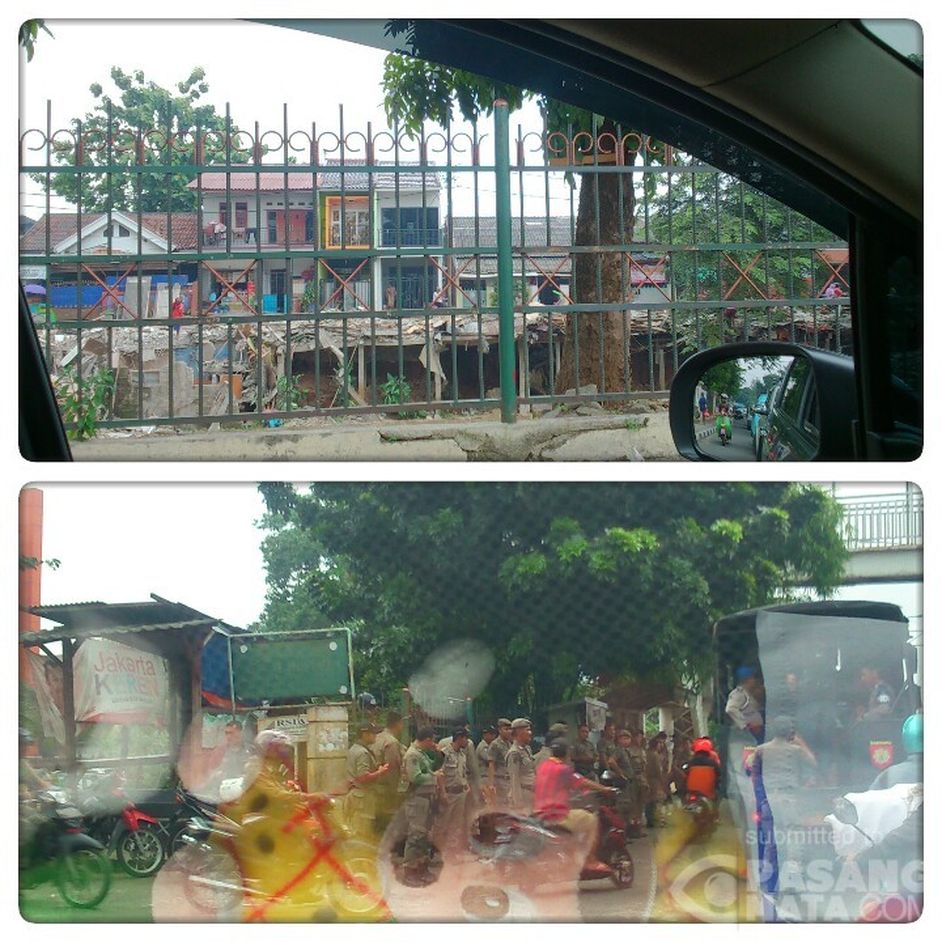 ratusan anggota satpol pp dan polisi bersiaga pasca pembongkaran rumah sepanjang bantaran kali hek pasar induk kramat jati jakarta timur