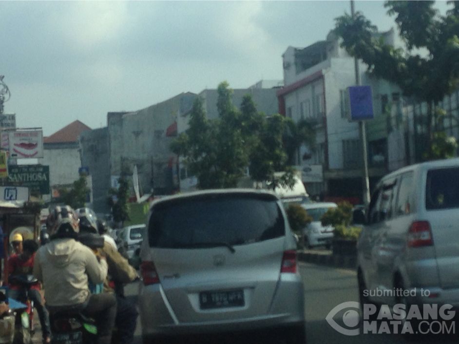 Lalu lintas di depan kampus UMJ macet panjang di 2 arah. Lokasi: Jalan Insinyur Haji Juanda, Ciputat, Banten