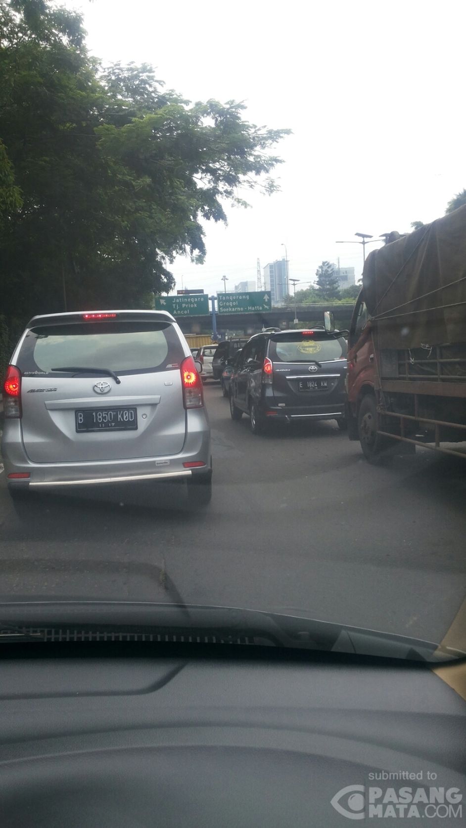 Lalu lintas tol Cawang antrean padat kendaraan sore ini .