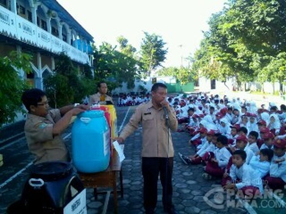 Guru Madrasah Ibtidaiyah Negeri (MIN) Jetis Kabupaten Sukoharjo melakukan penyuluhan membuang sampah yang benar pada Senin (14/3/2016). Penyuluhan dilaksanakan dalam rangka pembiasaan hidup bersih dan menyambut penilaian Adipura di Kabupaten Sukoharjo.