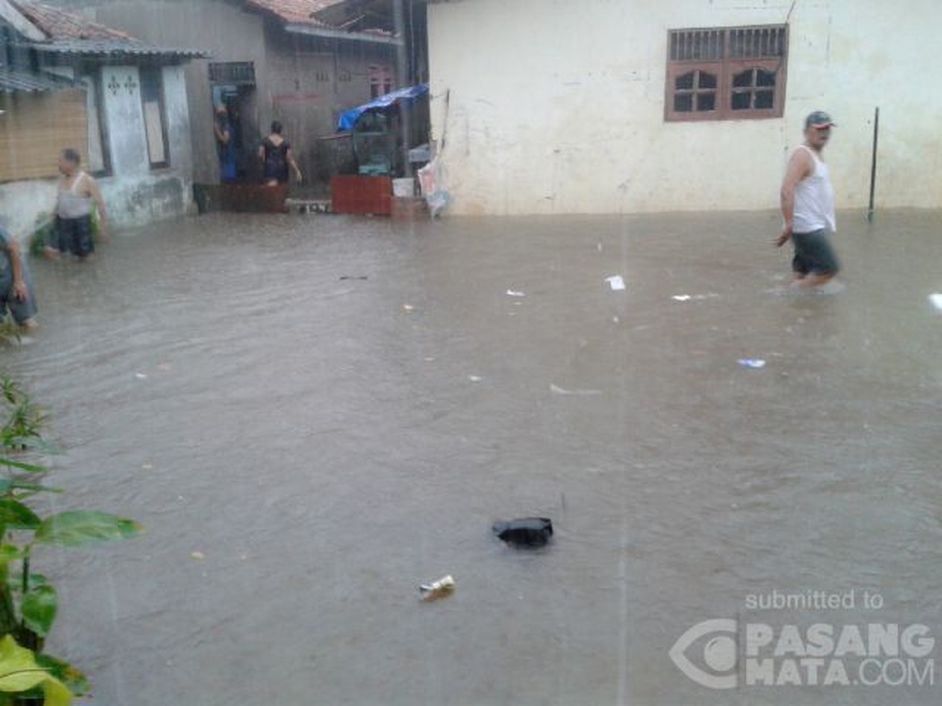 Penampakan Warga yang melintas di Air banjir di atas lutut yang terjadi di Gang Joko Lenteng Agung Jakarta Selatan sore ini.
