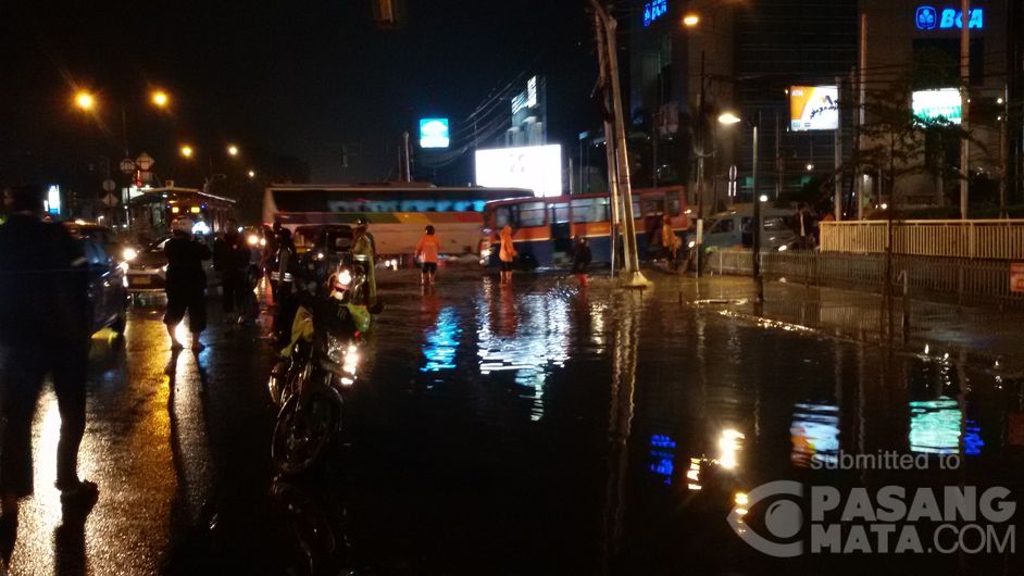 Ada genangan air setinggi 10-20 cm di Arion Mall, Sudah ada petugas dari kepolisian dan dishub yang mengatur lalu lintas. Lokasi: Jalan Pemuda Pulo Gadung