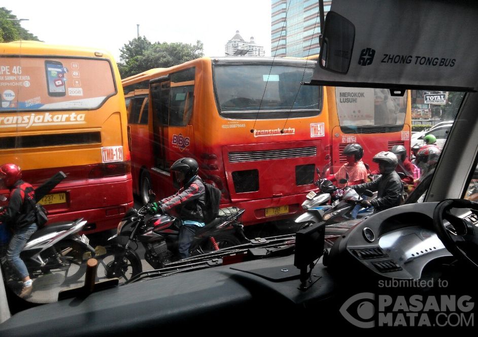 Penampakan TransJ yang harus rela jalan di jalur umum, karena jalurnya diambil taxi.