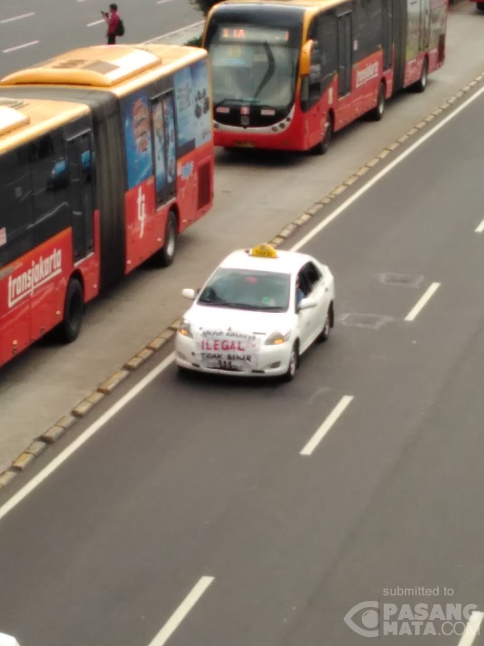 Taksi melintasi jalan Sudirman arah Bunderan HI dengan membawa spanduk yang berisikan penolakan terhadap taksi online