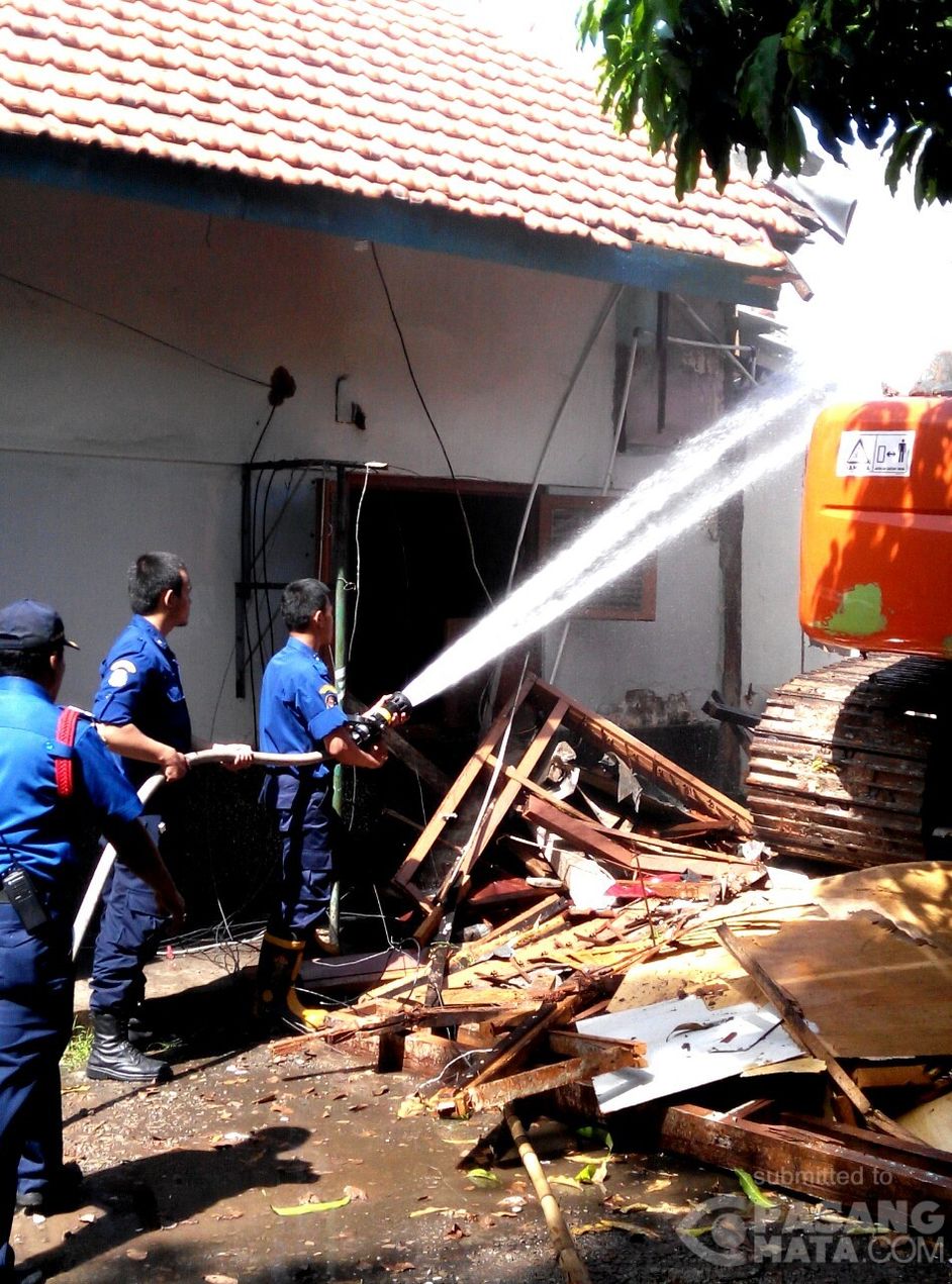 Damkar Pos Bungur turut serta membantu menyiram air guna meredam debu yang beterbangan akibat rumah yang digusur.
