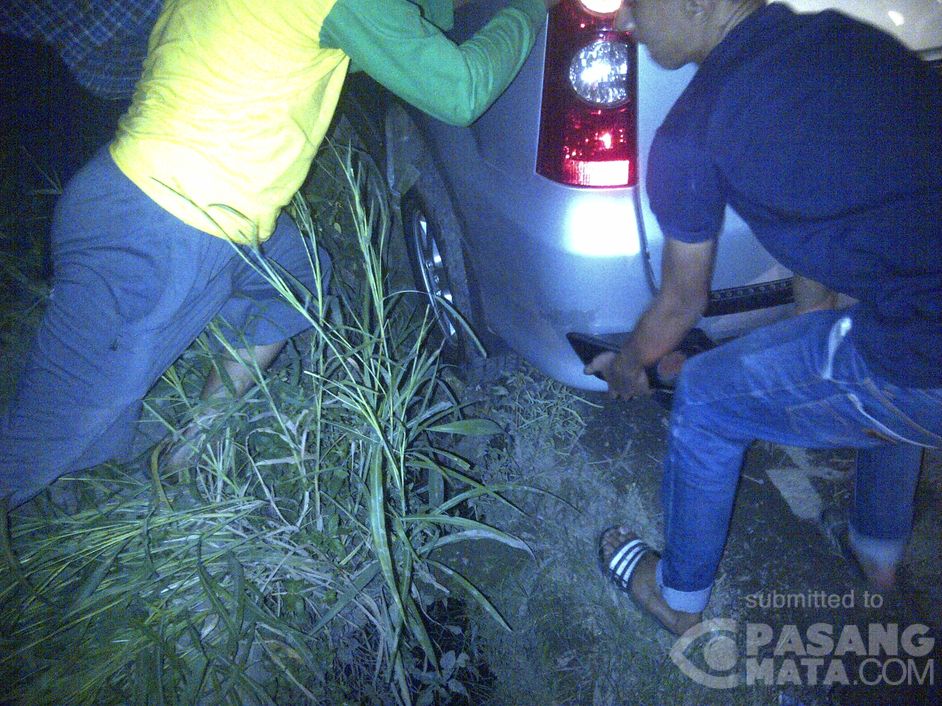 Akibat minimnya penerangan jalan ada mobil terperosok ke saluran air/got di jalan H. Naman, Pondok Kelapa