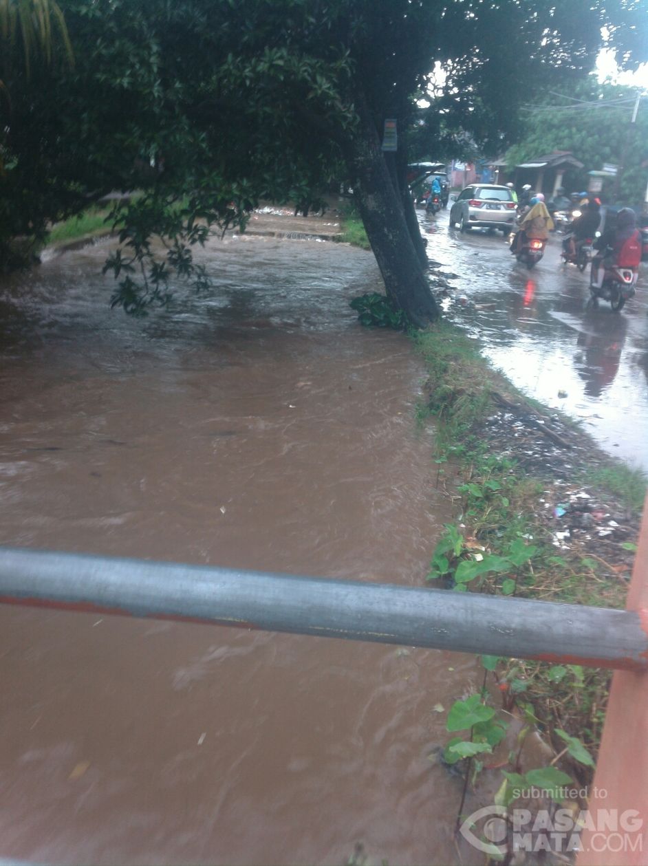 karena hujan deras semalam kali di jl raya tanah baru depok meluap ke jalan raya