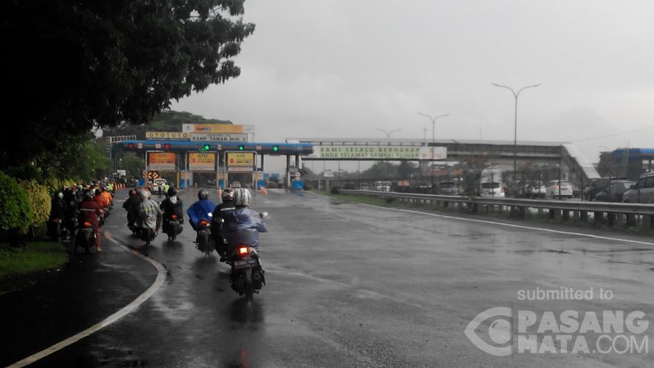 Banjir di pertigaan Hek, Motor dari arah TMII di arahkan masuk tol Taman Mini exit UKI