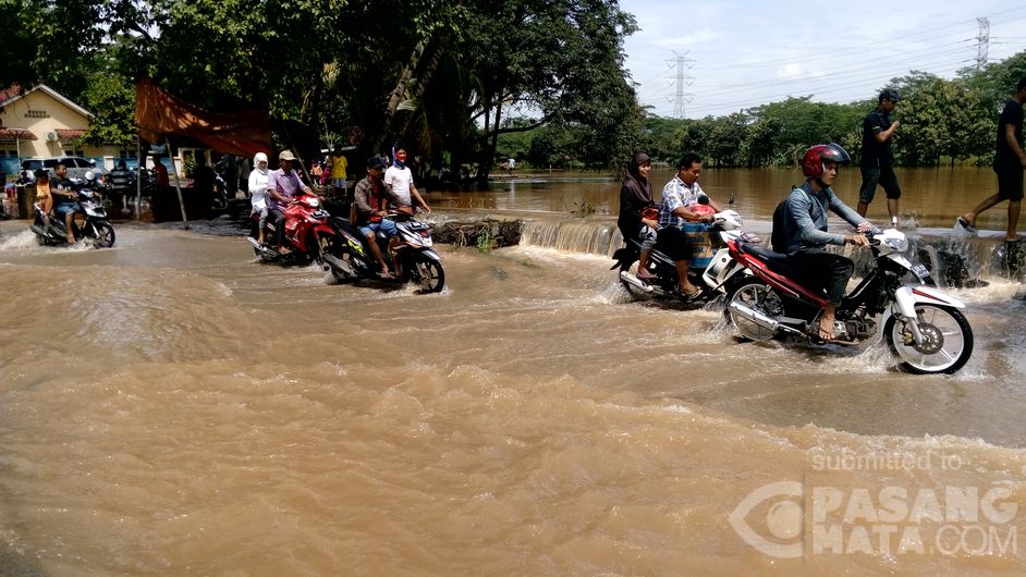 Genangan air terjadi di jl raya desa Cikeas akibat meluapnya air yang melebihi tanggul pembatas danau