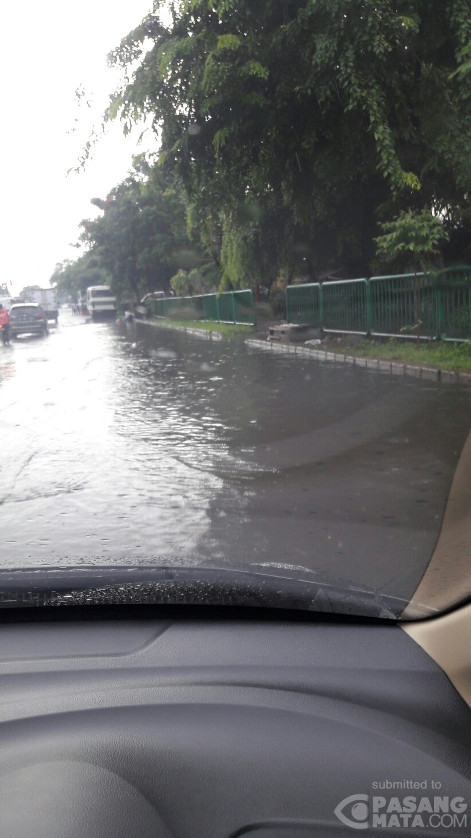 Genangan air menjelang perempatan Rawa Bokor - Tangerang membuat lalu lintas semakin macet karena kendaraan menghindar area genangan dan menumpuk di tengah