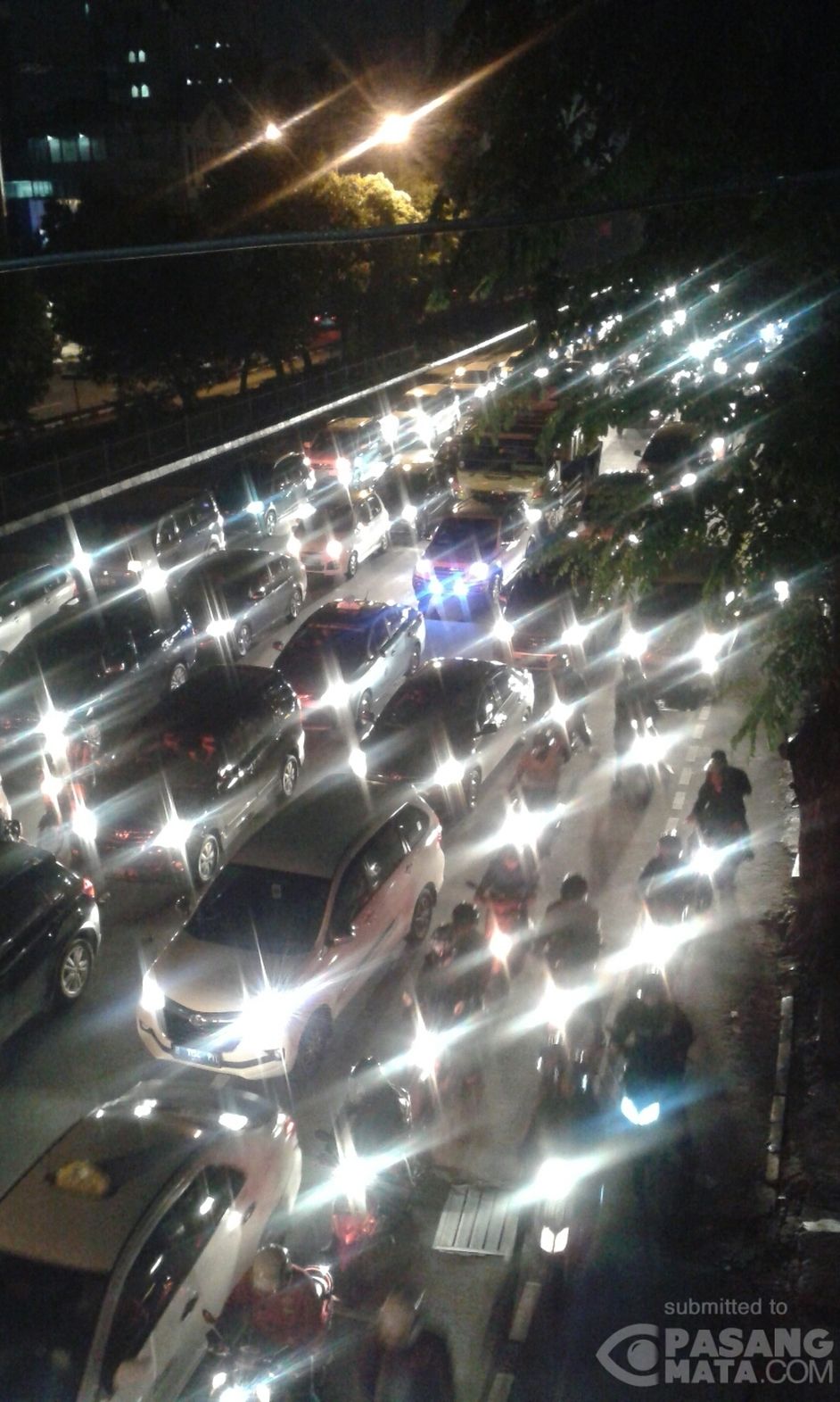 Dari JPO Carolus lalu lintas macet parah di ruas Jl Salemba Raya menuju perempatan Matraman pukul 19.00 WIB