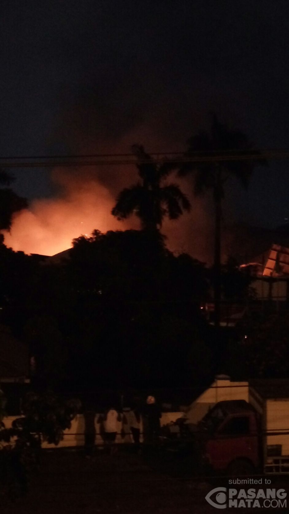 Kondisi kebakaran saat ini pukul 18.40 WIB di Jalan Gatot Subroto Cibodas Tangerang. Tampak api masih menyala di pabrik Starnesia .