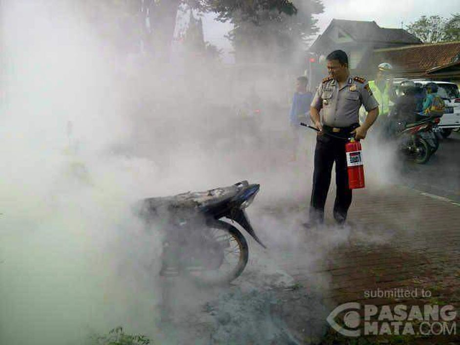 Bapak Kapolres Sleman memadamkan motor terbakar di jln Magelang km 10.6 Sleman. pengendara Sepeda Motor yamaha AB3372YZ Syaiful anam, 17th. Kronogis kejadian, semula sepeda motor yamaha AB3372YZ datang dari arah Magelang ke Yogya dengan kecepatan sedang sesampai di tkp (Bangjo-Beran) terkena percikan api dan akhirnya terbakar. tidak ada korban jiwa.