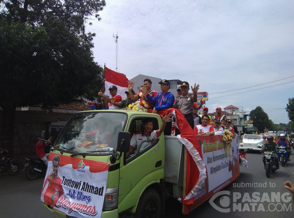 Peraih medali emas olimpiade Brazil Tontowi Ahmad pagi ini diarak dari tanah kelahirannya desa Selakanda, Kec. Sumpiuh, Kab. Banyumas menuju ke pendopo Sipanji Kabupaten Banyumas. Didampingi Bupati dan Wakil Bupati Kabupaten Banyumas, atlet bululutangkis ganda campuran ini terus menebarkan seyum dan melambaikan tangan sepanjang rute yang ditempuh.