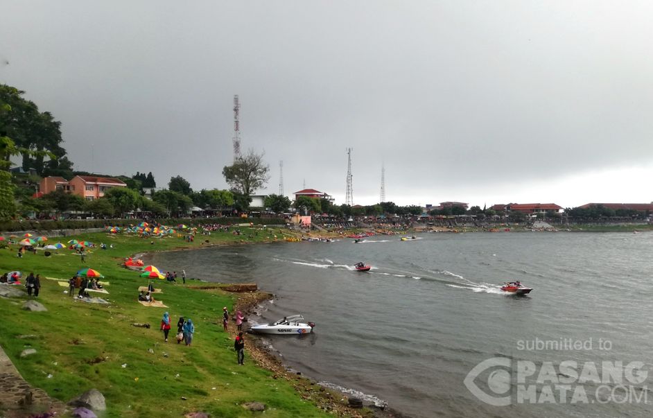 Libur akhir pekan, banyak wisatawan berkunjung ke telaga Sarangan untuk refreshing dan bersantai di tepi telaga dengan beralaskan tikar serta payung, seperti berada di pantai.