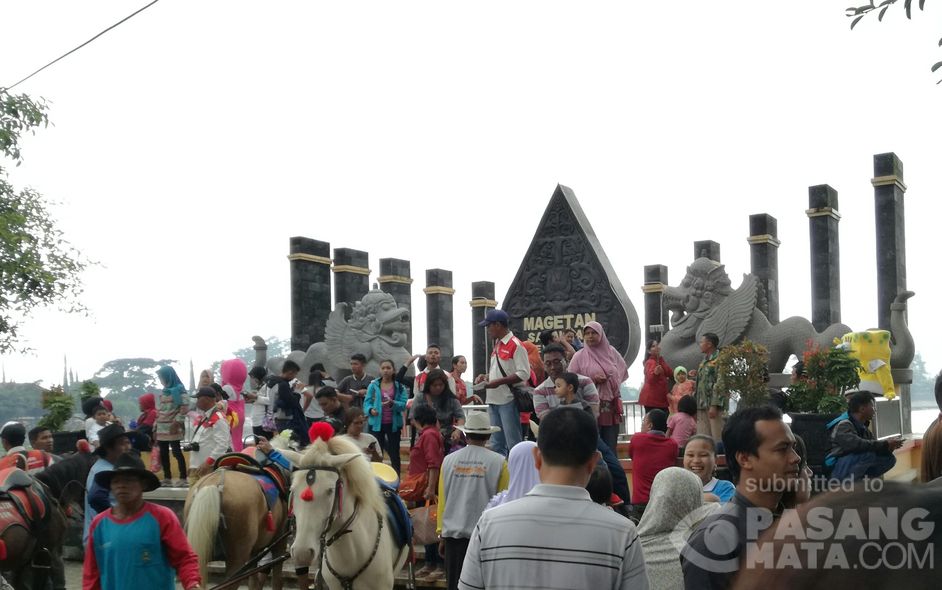Antrian wisatawan yang ingin berfoto selfi di dekat dua patung naga raksasa yang menjadi ikon dari telaga Sarangan.