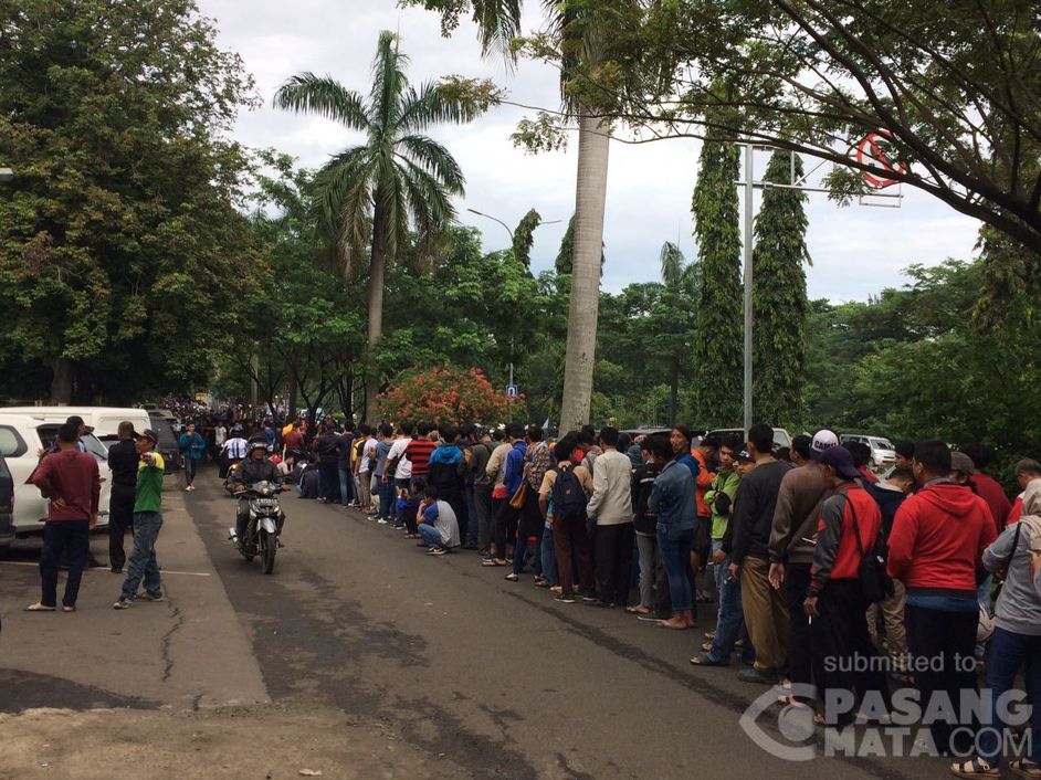 Begini penampakan panjangnya antrean penggemar sepak bola yang akan membeli tiket final AFF 2016 di Cibinong, Bogor pagi ini.