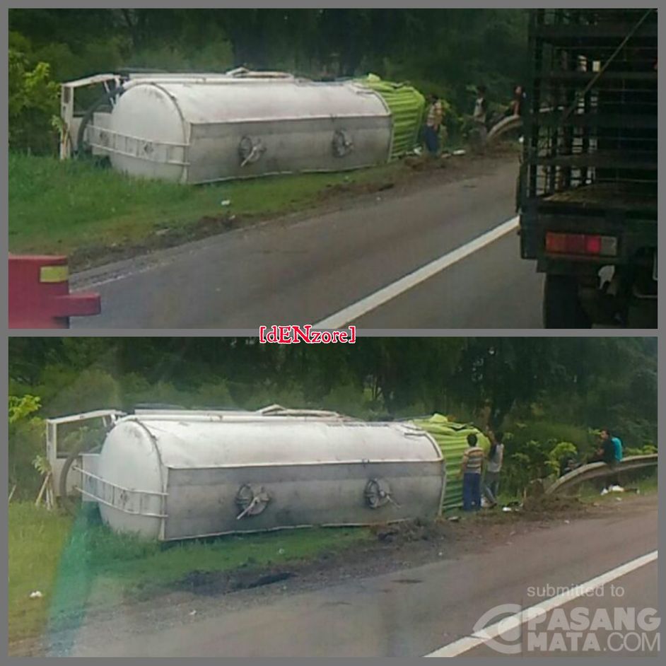 Penampakan Truk Tangki Terguling di Tol Arah Cikampek