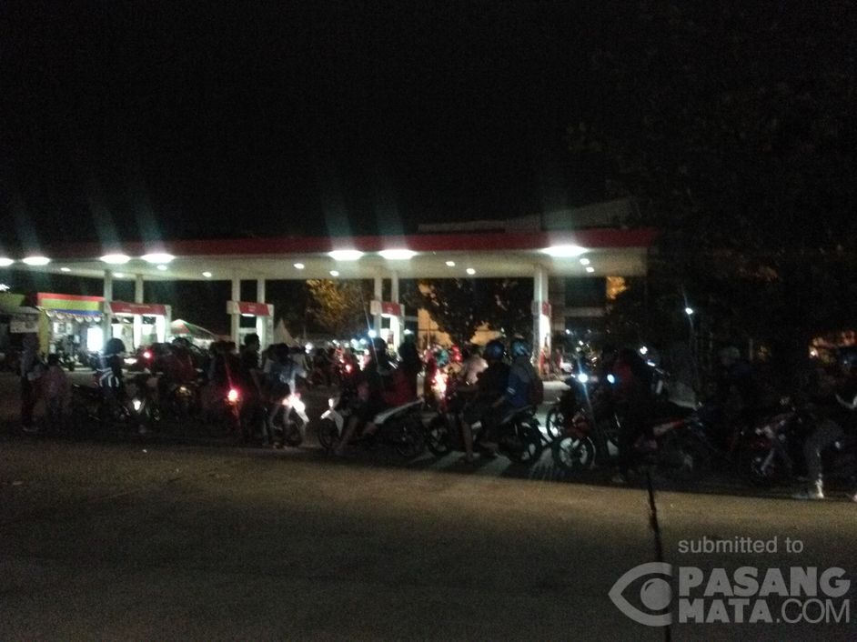 Tampak suasana malam tahun baru antrian panjang para pengendara motor yang hendak mengisi bahan bakar di SPBU, Jl. Raya Tegar Beriman, Pemda Bogor, Jawa Barat