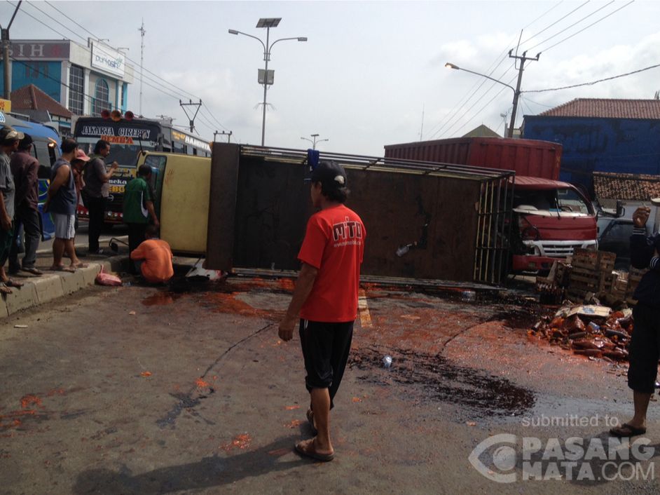 Truk bermuatan saus terbalik akibat ditabrak truk box di jalur Pantura Jatisari akibat rem blong, tak ada korban jiwa