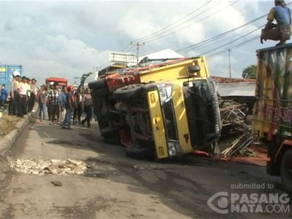 Truk Muatan Besi Terbalik Lalin di Jl Karawang Timur Macet