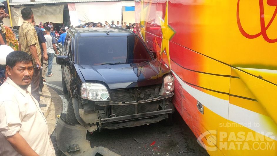 sebuah mobil menyalib bus Sempati star akhirnya terserempet dan nyangkut di Bundaran Pelor Meulaboh. Senin ( 09/01/2017)