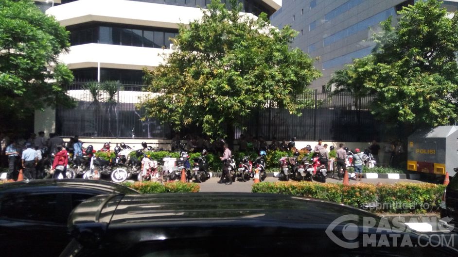 tampak banyak polisi yang berjaga-jaga di depan kedubes arab saudi, ada juga barakuda dibersiagakan. lalu lintas sekitaran kuningan tersendat karena jalur lambat depan kedubes arab saudi di tutup