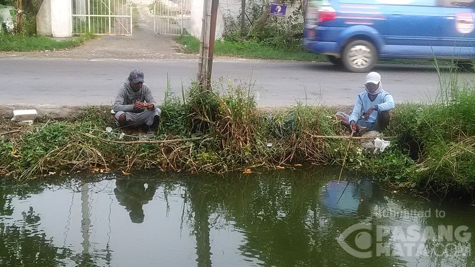 Warga manfaatkan saluran irigasi yang meluber dengan memancing karena banyak ikan tambak yang terbawa arus.