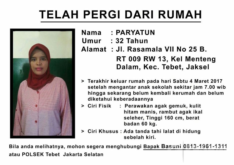 Telah meninggalkan rumah sejak 4 Maret 2017, waktu itu pergi tanpa pamit, tapi sebelumnya sempat bilang mau berobat namun tidak membawa kartu sehat dan tidak membawa HP. Sampai sekarang belum tahu keberadaanya. Mohon saudara sekalian yang pernah melihat atau menemukan bisa hubungi nomor telp yang tertera atau hubungi Polsek Tebet Jakarta Selatan. Terima kasih.