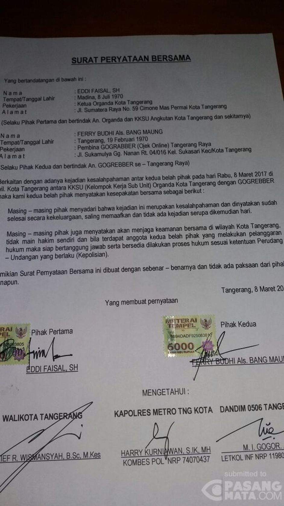 Pkl. 09.00 wib.Isi kesepakatan damai antara ojek online dan pngemudi angkot di kota tangerang. setelah kemarin