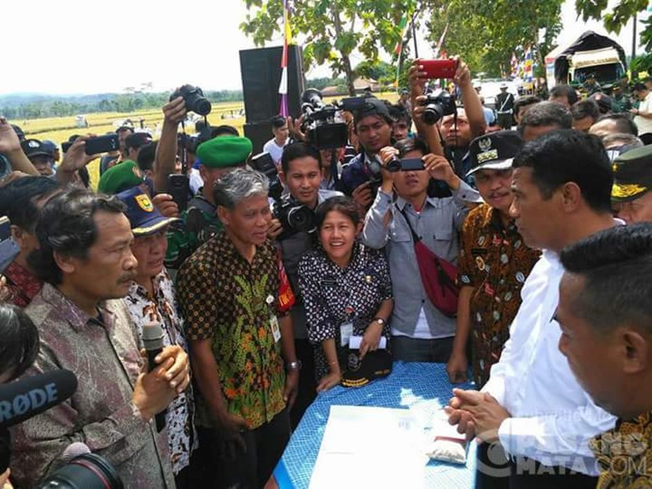 Tampak para warga sedang berinteraksi dengan Menteri Pertanian (Dr. Ir. H. Andi Amran Sulaiman, M.P.) yang berkunjung di Desa Megulung Kidul Kec.Pituruh, dalam acara Panen Raya & Serap Gabah Petani (SERGAP).
