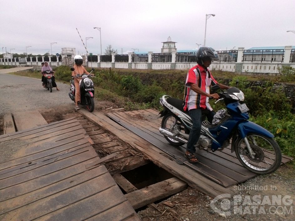 Jembatan penghubung desa Ujong Tanjong dan Ranto Panyang Timur Aceh Barat tak kunjung diperbaiki. Jembatan hanya bisa dilewati roda dua