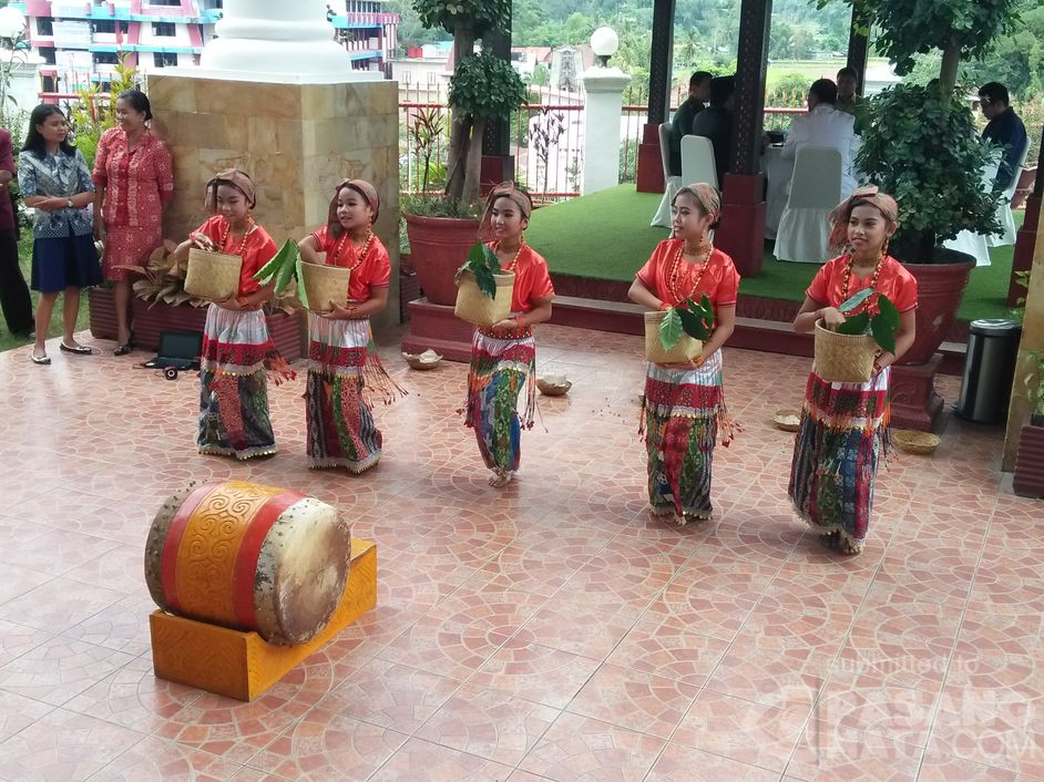 Sejumlah siswi sekolah dasar di kabupaten Tana Toraja menampilkam tarian tradisinal Toraja untuk menyambut tamu yang datang berkunjung ke Toraja