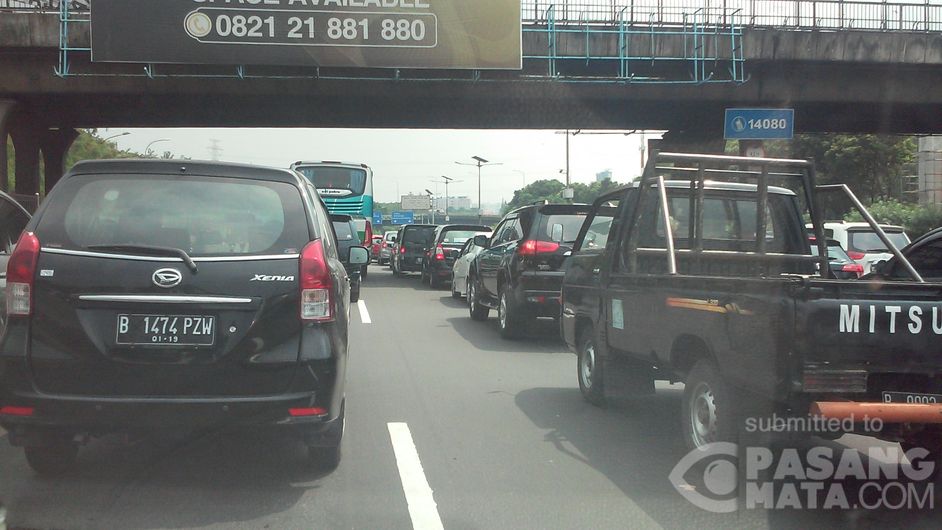 Pukul 13.49 Lalu lintas tol dalam kota dari arah jatibening menuju ke Semanggi terpantau padat pada siang ini, pengendara tujuan bandara disarankan melewati jalur tol ruas tanjung priok yang siang ini terpantau cukup lancar.