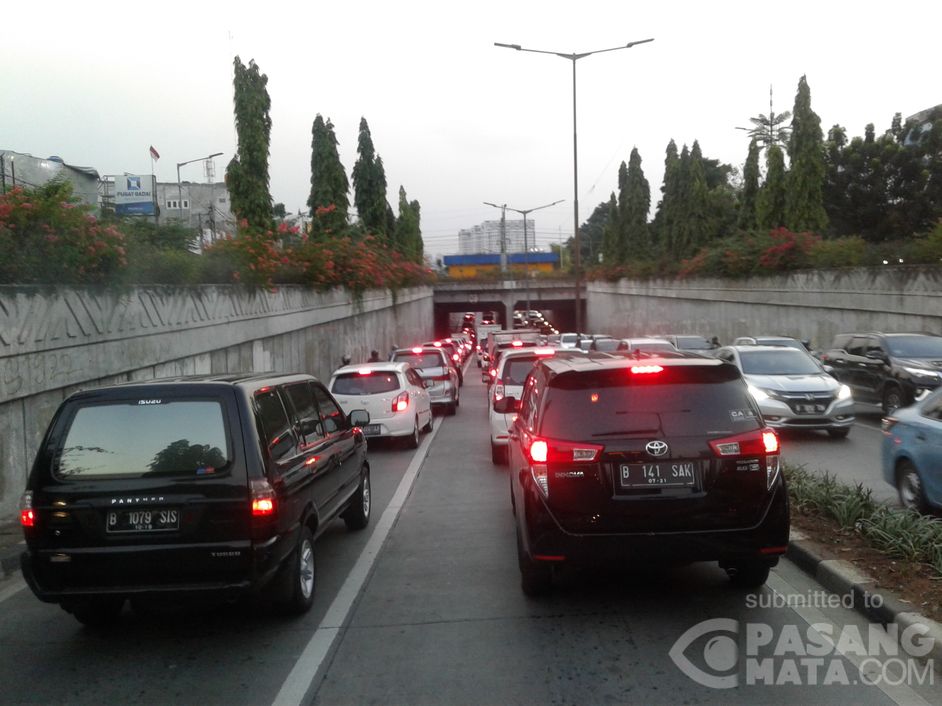 Suasana di jalan bawah kolong Pramuka arah Salemba terpantau padat merayap sore hari ini