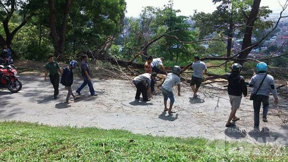 Pohon tumbang sekitar jam 10 30 di ruas jalan dekat perum Cabuki Batam di bersihkan warga agar pengendara bisa melintas